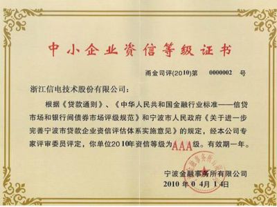 经宁波市中小企业信用评级专业机构开展的定性、定量的综合分析评估和专家评审后,hth·华体被评定为2011年宁波市中小企业AAA级