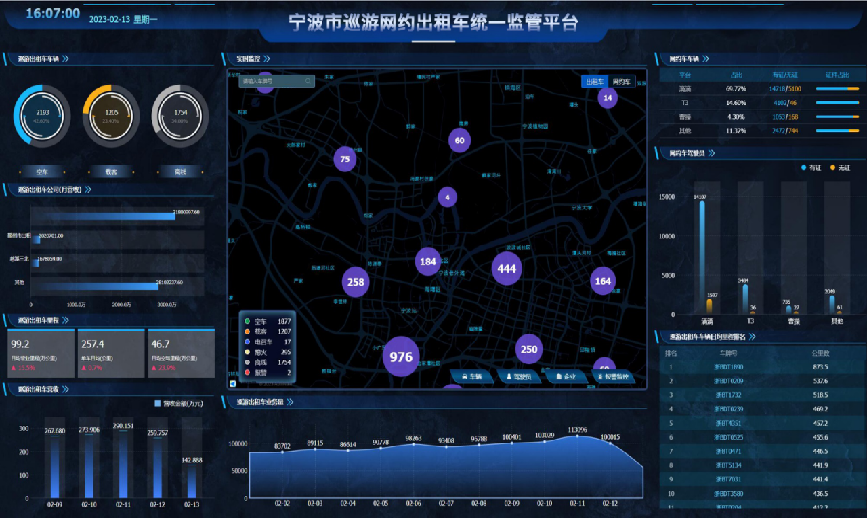 平台用以提升巡游出租车和网约车的服务品质、强化行业监 管、保障司乘安全、满足出行需求,促进出租汽车行业转型升 级和健康、稳定、有序发展,对外为公安部门提供报警和治安 服务、为社会公众提供更安全、更便利、更优质的出行服务, 对内为交通运输局、综合行政执法队、公路与运输管理中心等 单位提供行业管理服务。平台对各类经营数据、车辆及人员轨 迹、服务质量等核心数据进行实时监控统计,并通过大数据引 擎智能研判多种场景,如聚集、罢运、恶性竞价等敏感事件, 从而提前实施预案,保障突发事件平稳解决。